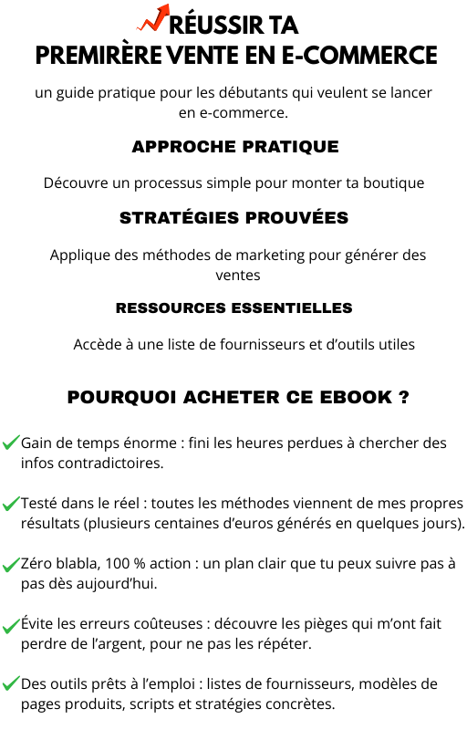 ✅ Oui, l’ebook est conçu pour être clair et accessible, même si vous n’avez jamais fait de e-commerce. Vous y trouverez des explications pas à pas et des actions simples à appliquer.
